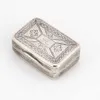 An early Victorian silver book shaped vinaigrette, pierced and engraved grille with central flower motif, hallmarked by Taylor & Perry, Birmingham, 1840, 0.45 ozt (14 grams), 3.5 x 2cm. Further detail…