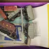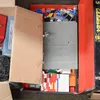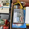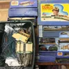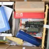 A box of model railway items including control units, track, engines, carriages and a station. Mostly Triang